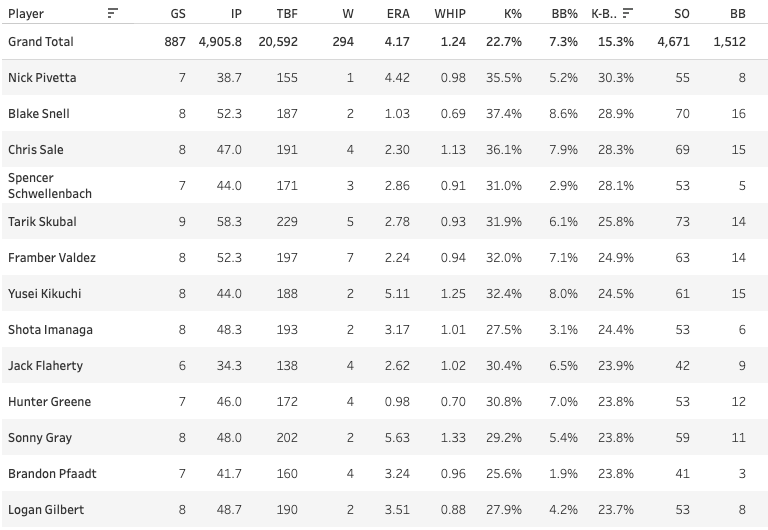 During that time, his Ball% is down to 34.9%, a strong number for anybody - but it’s completely elite for Snell. He has a 19.2% SwStr% and just a .210 xwOBA allowed to go with it. No pitcher is better than Snell right now.