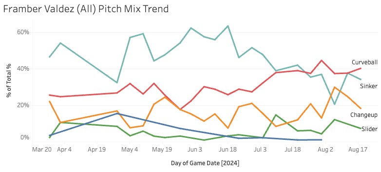 A 34% K% from Framber Valdez doesn’t make a lot of sense. Did something change? The answer is YES. He has recently traded sinkers for curveballs and changeups.
