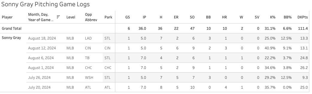 Sonny Gray has had some really bad luck lately. He has a 5.50 ERA over his last six starts despite an elite 31% K% and great 6.6% BB%.