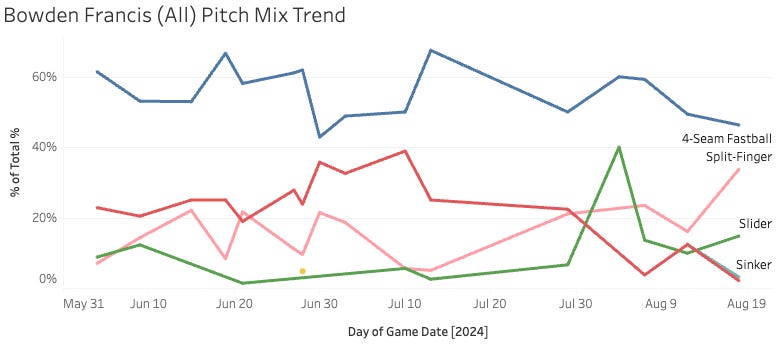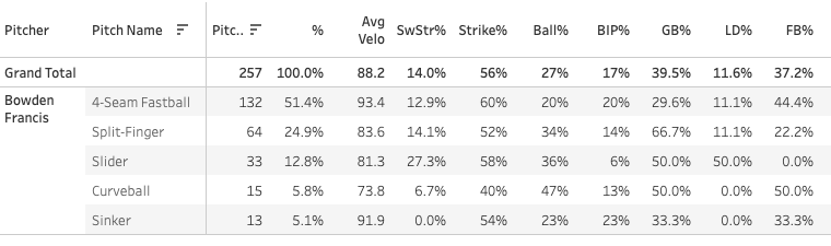 The splitter usage has come up in these last three outings as a starter. For the season, he’s used it 16% of the time, but recently, it’s 25% - and you can see the high Strike% on that pitch as well. The league-average splitter has just a 42% Strike% but a 17.8% SwStr%. So he’s landing his for strikes more often than the normal splitter (44% Zone% for Francis vs. a league average of 37%).