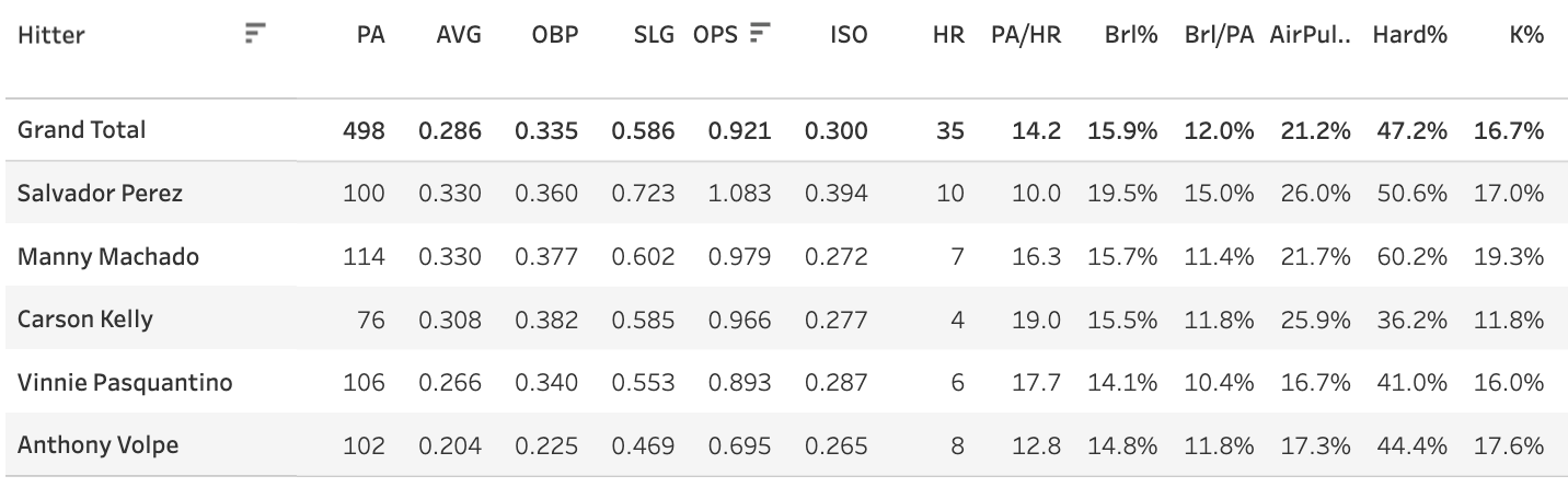 What a list! Anthony Volpe has eight homers and a 14.8% Brl% in his last 102 PAs. That was sub-20% K% and 14%+ Brl%, let’s drop it down to a 12% Brl%.