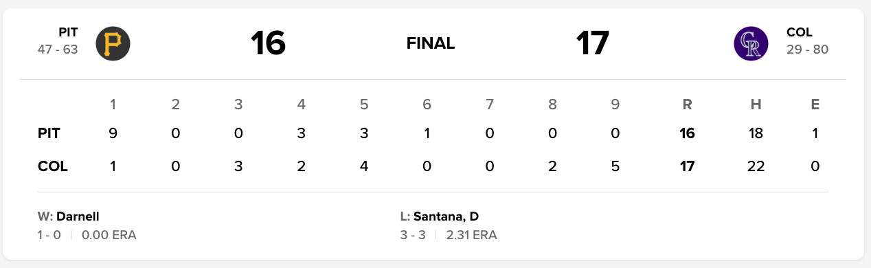 Dugan Darnell (COL): 2.0IP, 1H, 0ER, 1SO, 0BB