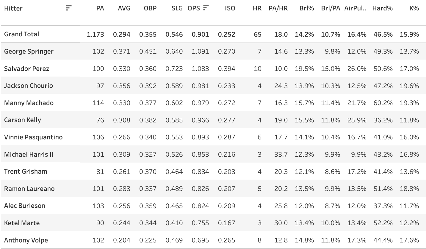 George Springer - 0.452 xwOBA, 10.5% Brl%, 75.6% Contact%, 22.6% Chase%, 11.5% K%
