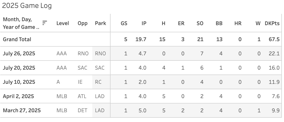 Chris Campos (LAD): 94 Pitches, 7IP, 6H, 1ER, 8K, 0BB, 30FPts