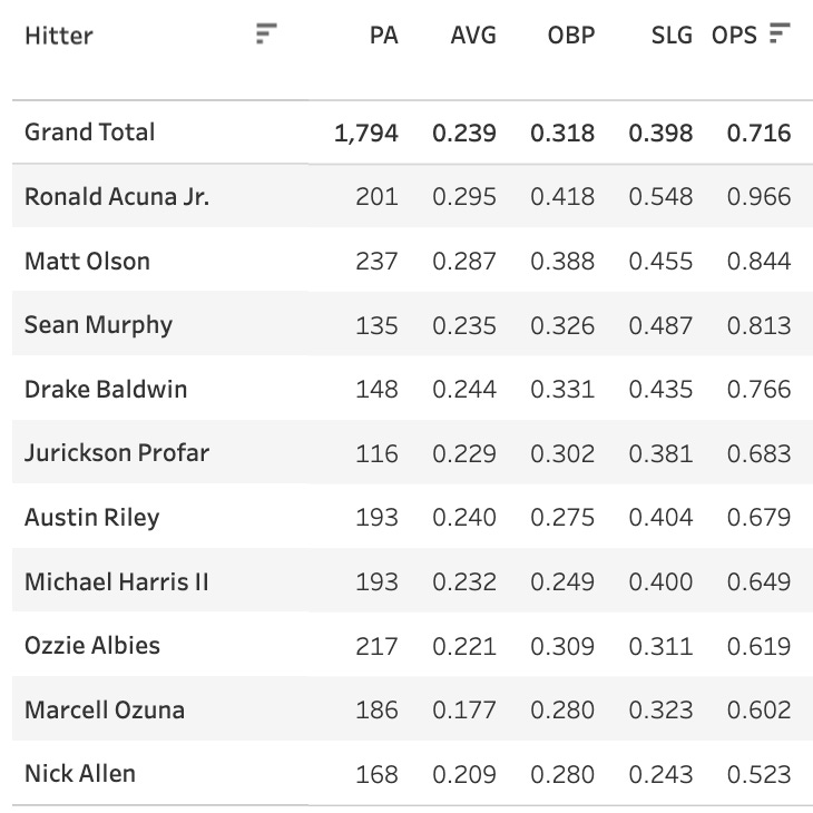 Only Acuna with a truly good OPS, and only Olson, Murphy, and Baldwin above water. So yeah, the Braves aren’t a very good lineup.