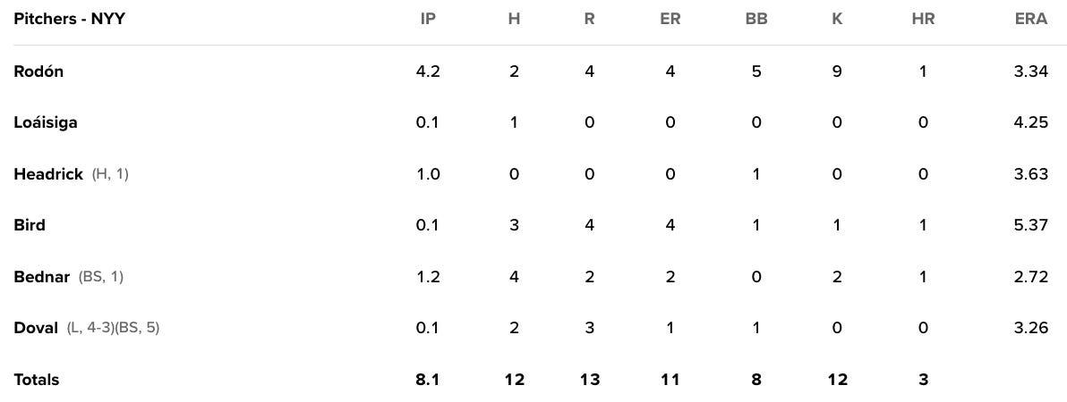 The new team debuts didn’t go super well! The Yankees' new bullpen is in wild fashion. The Bird + Bednar + Doval trio gave up nine hits and nine runs in 2.1 innings, blowing a huge lead to the Marlins: