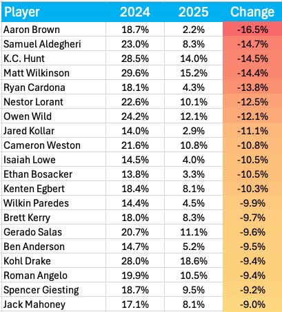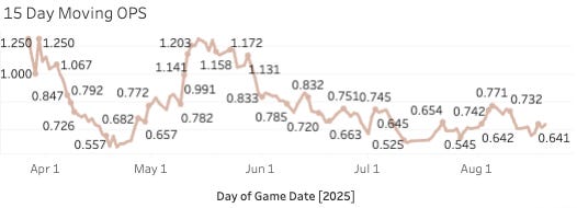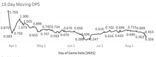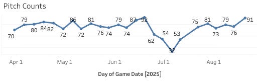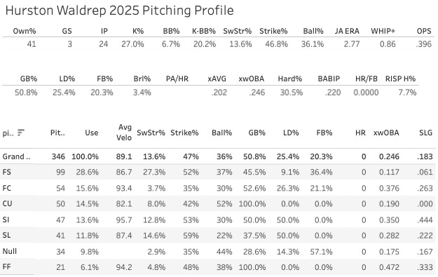 I wonder how Jacob Misiorowski feels. He came out so hot, made the All Star Game, and since then everything has been awful. He had an injury, and since coming back, he has a 22% BB% in two starts with a horrible 6.1% SwStr%. The command has disappeared. And that shouldn’t have been shocking, but the extent to which he’s fallen apart is surprising. Nobody expects a 22% BB%. But we’re talking about like five innings here. Anyways, I do think you can drop the guy in redraft leagues.