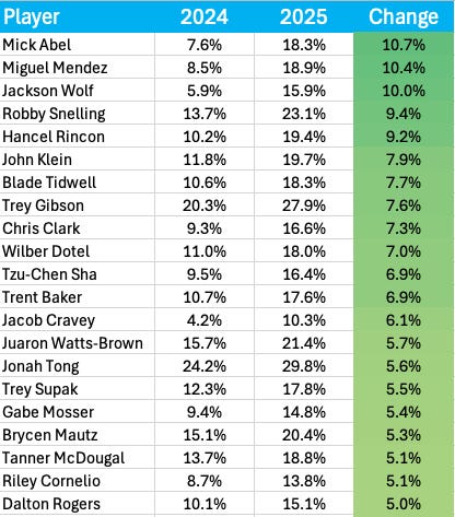 So I’m curious as to which minor league pitchers have had the biggest gains and losses in K-BB% from 2024 to 2025. Here is everybody with 350 batters faced in each of the last two years (in the minors only) with a K-BB% gain of at least five points.