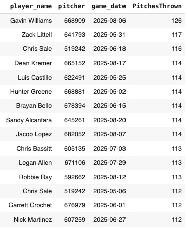 Sandy Alcantara appears above. He went for a 9:1 K:BB on an eilte 17.5% SwStr% and 55.3% Strike%. That makes two really good starts in a row (16:2 K:BB, 29 whiffs, 58% Strike%). He threw 114 pitches last night! He was just the ninth pitcher to go for that many pitches.