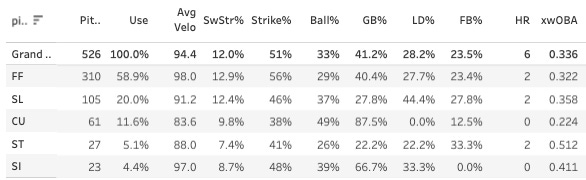 I’m not surprised to see a very good start from Schlittler. He has the stuff for these kinds of things. It’s just a matter of finding a night where the command is there. Here’s the pitch mix data for the year:
