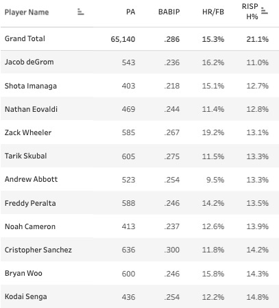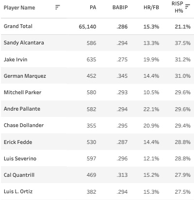 There are very few names I’ve heard of here. Quinn Mathews hasn’t qualified this year with just 73 innings. But he has lost 17 points on his K-BB%. He went from 27% last year to 10% this year.