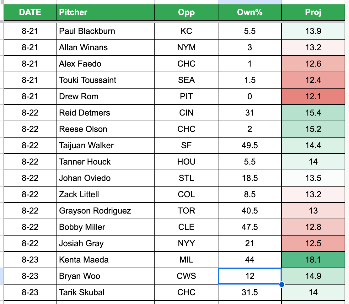 What this does is takes all probable started under 50% rostered and gets their projected projection and sorts the data by that. So today’s recommended streamer would be Balckburn, tomorrow’s would be Detmers, and so on and so forth.