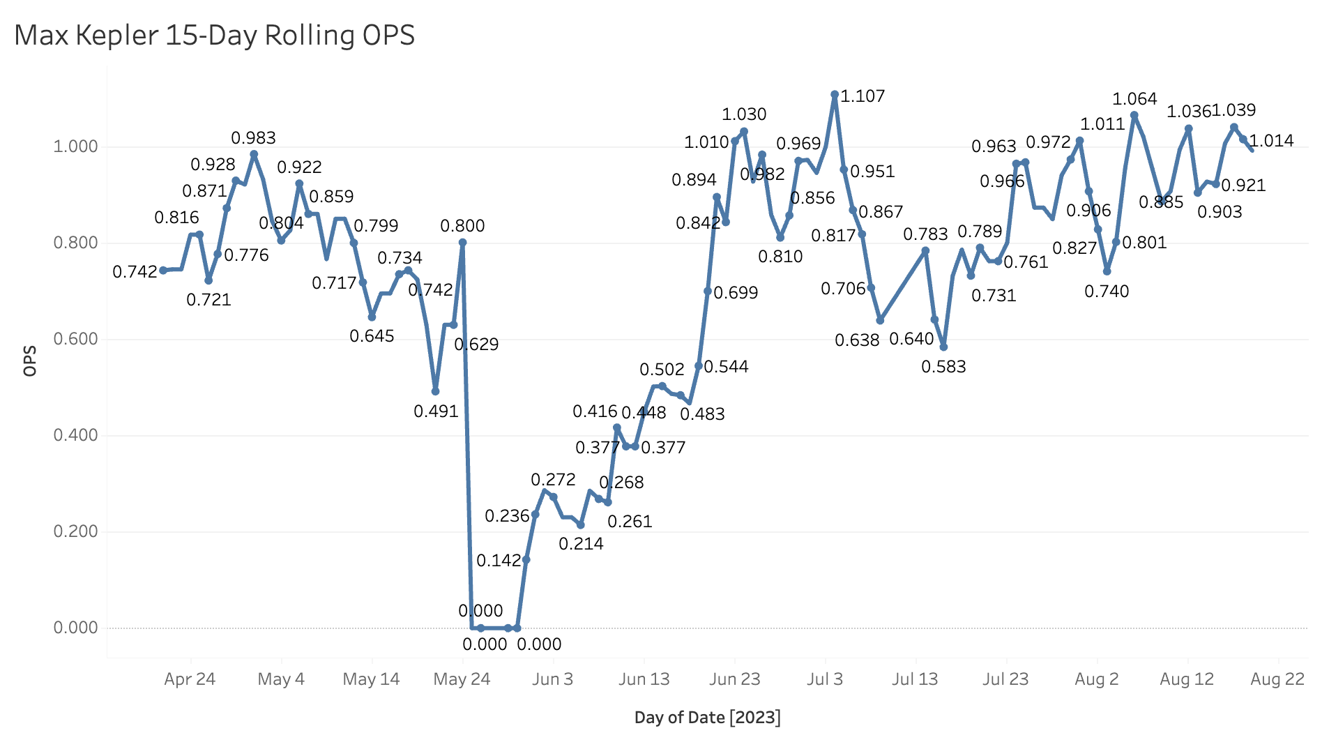 Max Kepler - 62 PA, 0.399 wOBA, 0.457 xwOBA, 0.058 Diff