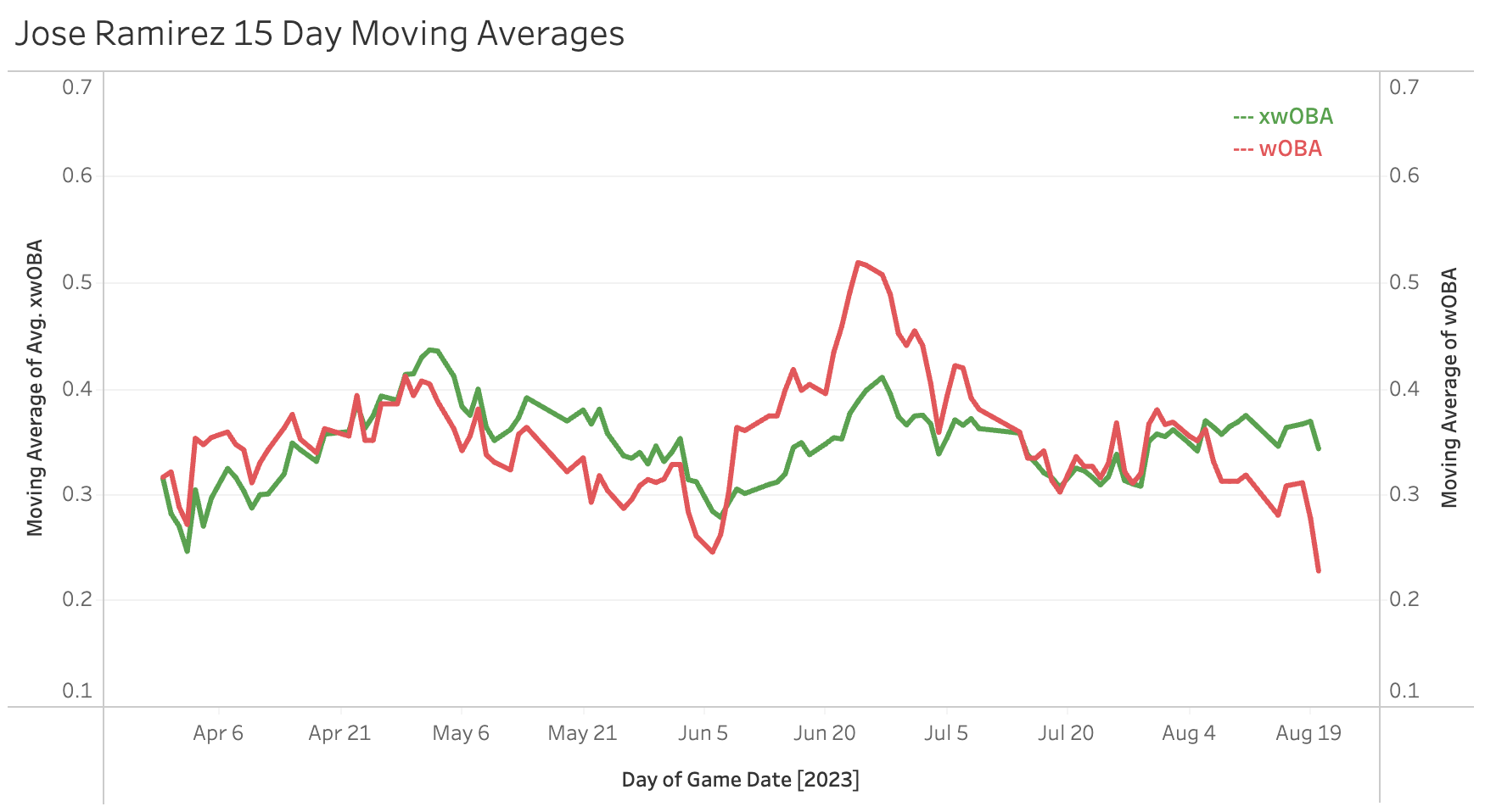 Jose Ramirez - 64 PA, 0.238 wOBA, 0.362 xwOBA, 0.124 Diff