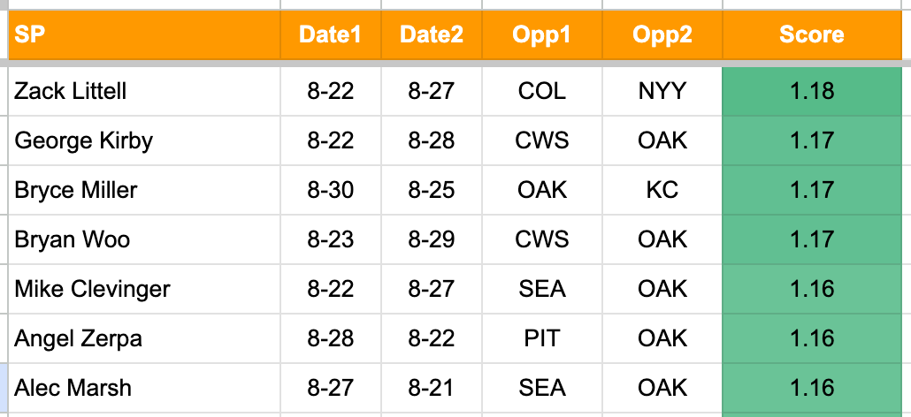 We’re probably entering the playoffs for a lot of leagues now, so now is a great time to have an eye on the SP Next 2 Starts SOS sheet. This is for paid subs, and it grades each pitcher based on their next two projected matchups. It’s a good resource for picking streamers. The top 7 currently: