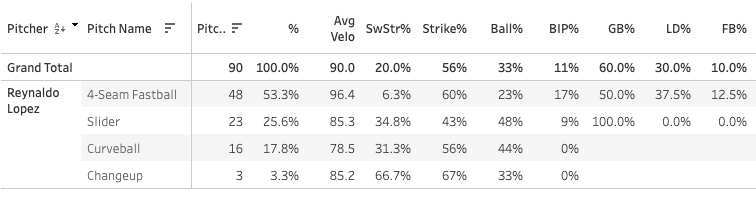 6 IP, 6 H, 2 ER, 8 K, 0 BB, 20.6% SwStr%, 51.5% Strike%, 32% Ball%Lopez