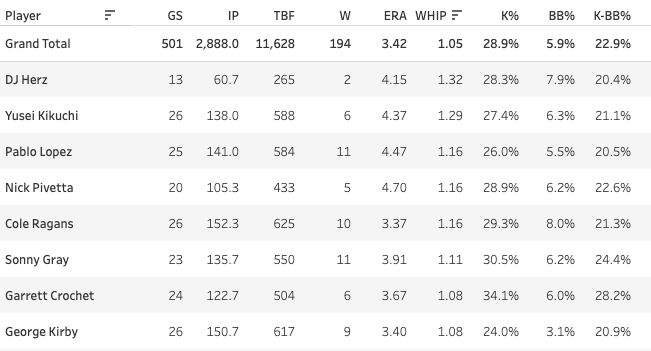 We have just 24 SPs this year with 10+ starts and a K-BB% over 20%. As a group, they have a 3.42 ERA and a 1.05 WHIP. Herz’s ERA is the fourth-worst on that list, and his WHIP is the worst.