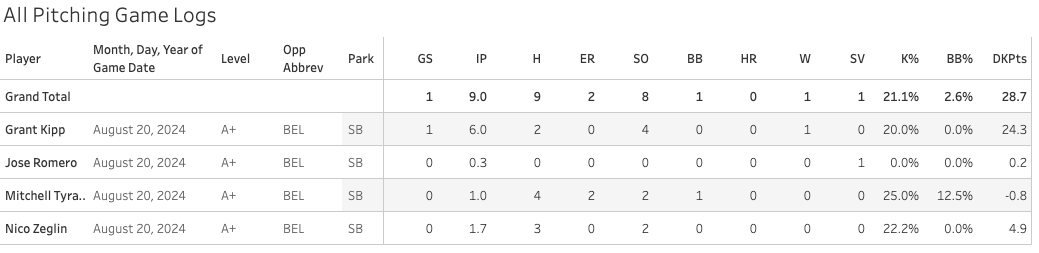 Caden Dana (LAA): 103 Pitches, 8IP, 3H, 1ER, 9K, 2BB, 35FPts