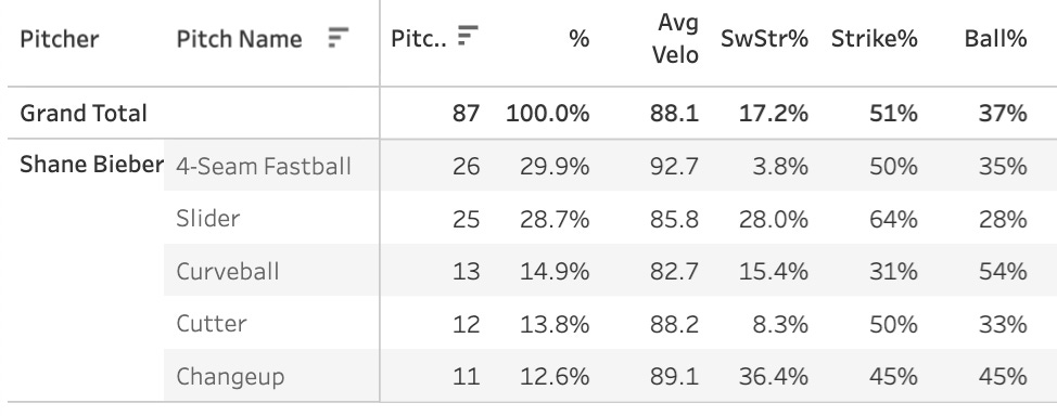 3. Shane Bieber (TOR): 15 Whiffs (87 Pitches)