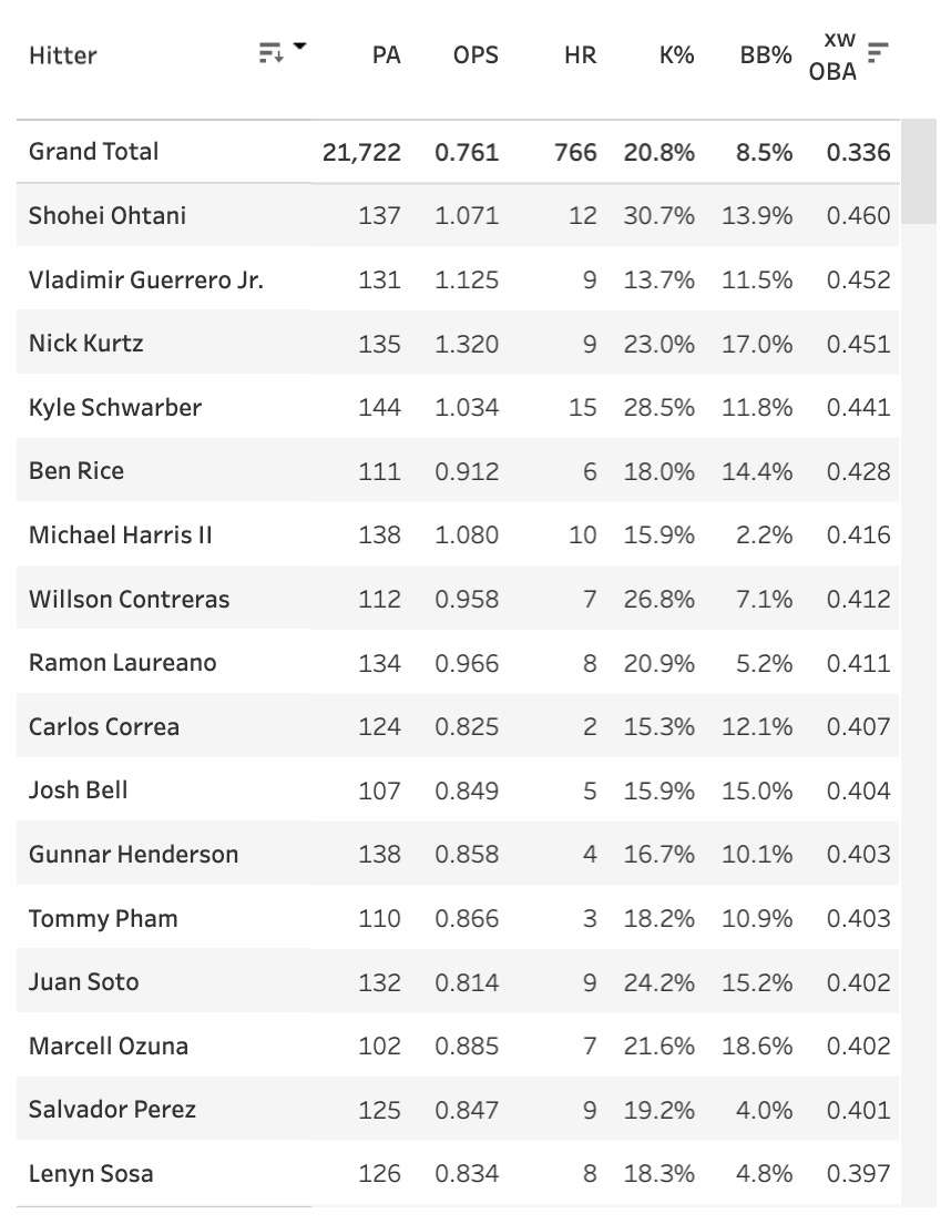 Josh Bell - 0.448 xwOBA, 15.8% Brl%, 82.8% Contact%, 25.0% Chase%, 8.2% K%