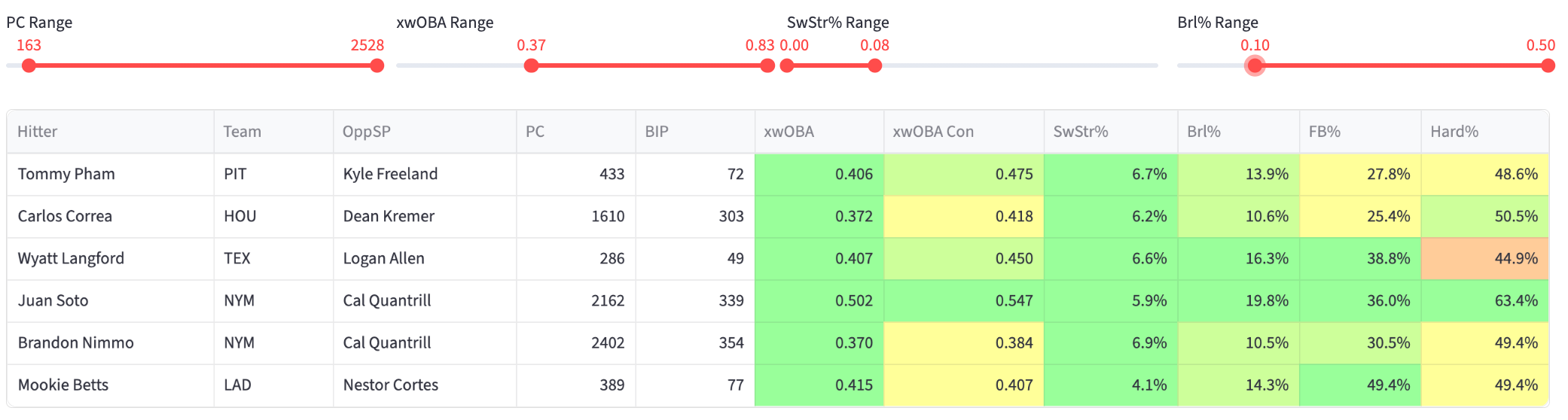 Mike Yastrzemski - 0.437 xwOBA, 11.1% Brl%, 85.7% Contact%, 17.7% Chase%, 11.5% K%