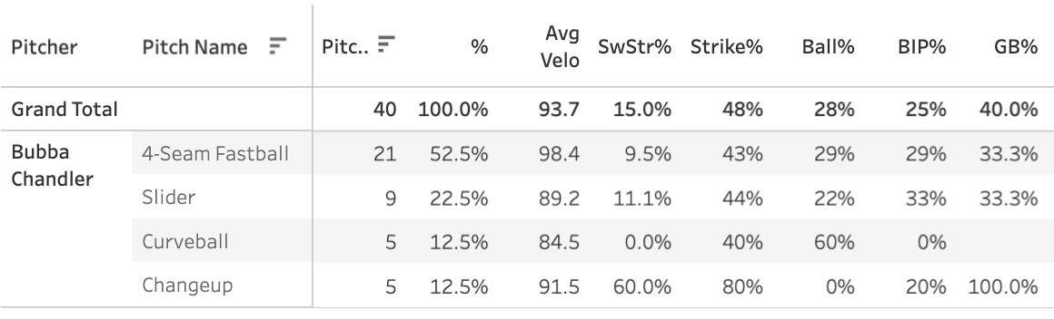Bubba Chandler was the other one. He and Braxton Ashcraft combined to shut out the Rockies in Pittsburgh. Chandler breezed through his four innings in 40 pitches, posting an encouraging 28% Ball%. He had a big lead and just went right at them with the fastball.
