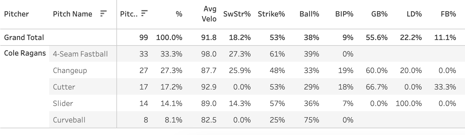 No pitch mix changes or anything like that, but his cutter and curveball were a little bit closer to each other in usage than normal. Just a good performance. He’s not the worst option for fantasy moving forward.