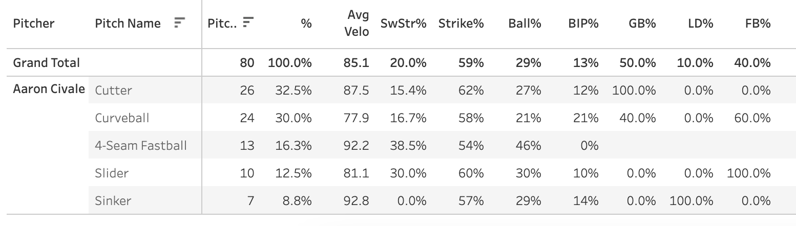 1. Aaron Civale (TB): 58.8 Strike%, 28.8 Ball%