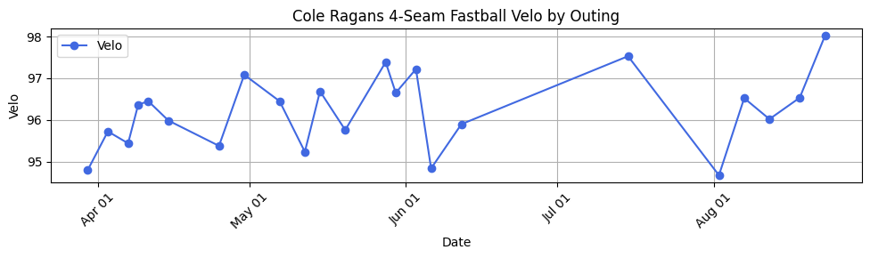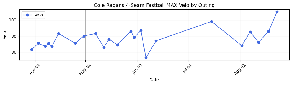 Cole Ragans's FF velo (33 pitches) UP 1.8mph to 98.0