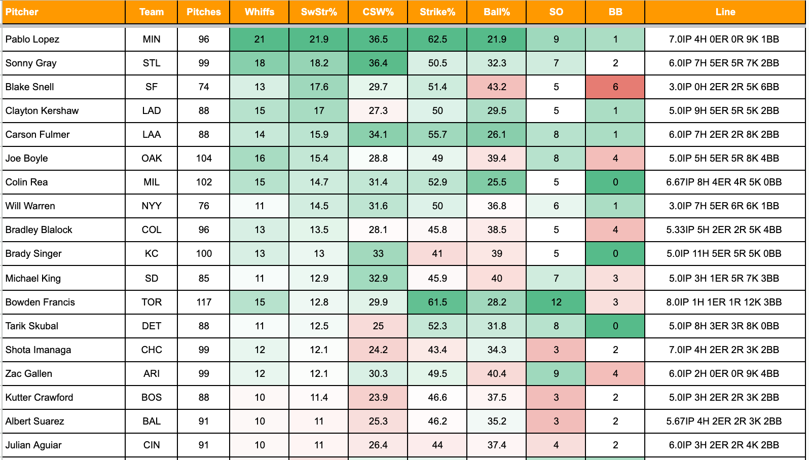 1. Pablo Lopez (MIN): 21 Whiffs (96 Pitches)