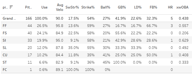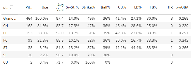 The issue we have is that he threw just 67 pitches. So there’s a low ceiling there. But he did get through five innings with hyper efficiency, and a really impressive 8:1 K:BB at that. That’s a lot of strikeouts for just 67 pitches. Here’s the season pitch mix data (MLB):