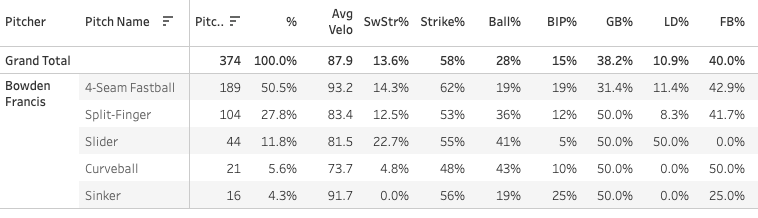 There has to be some very good fortune any time someone posts a 58% Strike%, even if it’s just a four-start sample. Hitters have helped Francis out, no doubt about it. The good thing here is that his four-seamer is getting whiffs (14.3% SwStr% is very high for a fastball), and the slider and splitter have worked very well to boot. A 12.5% SwStr% on a splitter is low, but the 53% Strike% is high. This might be more of a sinker than a splitter, I don’t know - I’ve never watched the guy pitch!