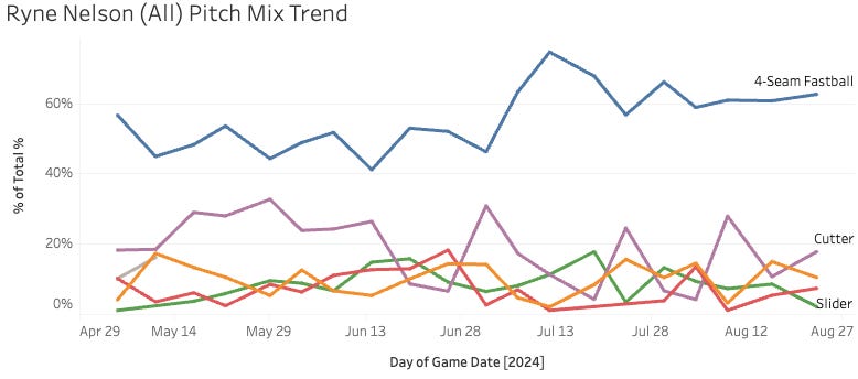 If you have a sinker with a 75 Stuff+ and you’re throwing it 60% of the time, a good way to raise your Stuff+ would be to throw that pitch less often. Let’s see if that’s what Ryne has done: