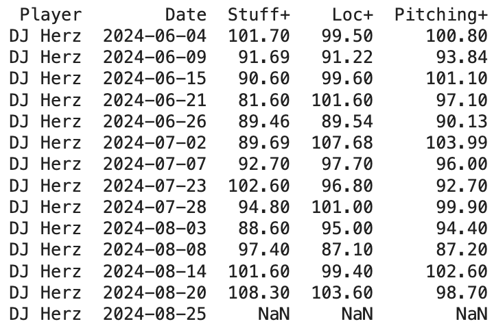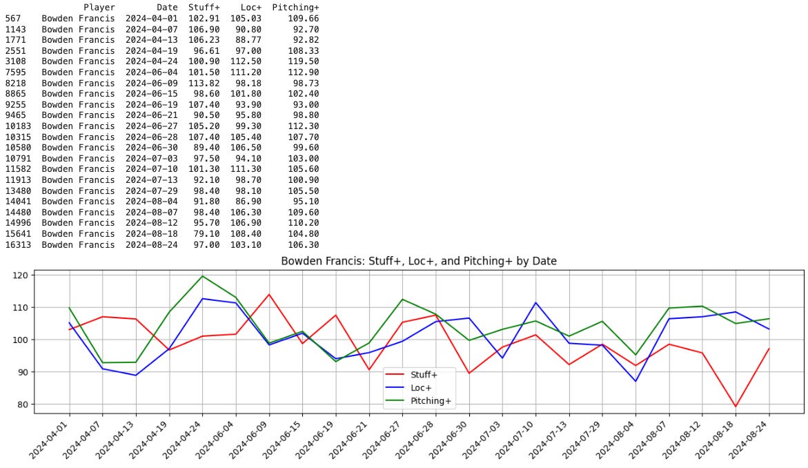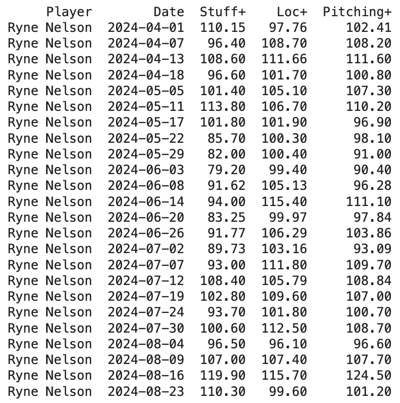 We see that his Stuff+ has been down lately. That is because he has entered the rotation and is having to throw more pitches. We would have predicted that - it’s nothing to worry about. What we have seen lately is that these Location+ marks have gone through the roof. Typically, you’ll see variance from start to start with Location+; it’s not a very sticky start at that level.