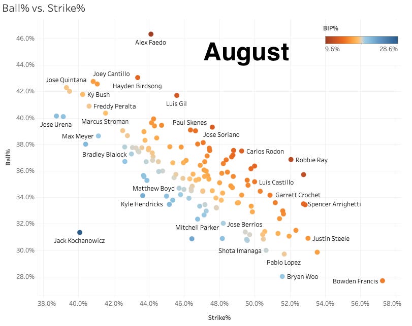 It’s hard to argue that he’s been the best pitcher in the league in August. His 1.40 ERA and 0.47 WHIP are ridiculous marks, and his 30.9% K-BB% leads the league. He has a 13.6% SwStr%, a 57.8% Strike%, and a 27.5% Ball%. Crazy numbers there as well.
