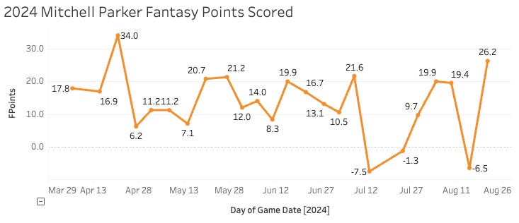 Mitchell Parker has had an interesting season. He predictably dominated the Rockies last week: