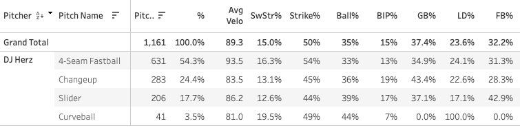 Herz is 6’2’’, so he’s not getting a big bump from his release point. His effective velo on the fastball is 94.3. That’s a positive, but it’s not near the league leaders (Logan Gilbert is first in the league at 93.9 actual but 96.5 effective).