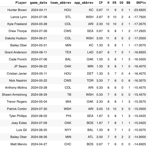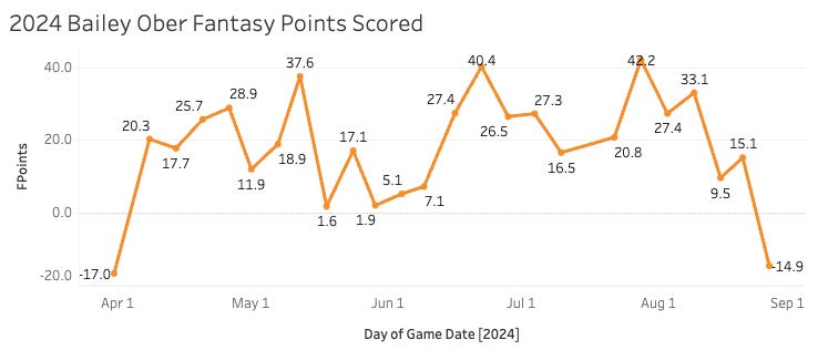 That’s Ober’s second start with less than -10 points in a single start. He now owns two of the season’s bottom 20 starts.