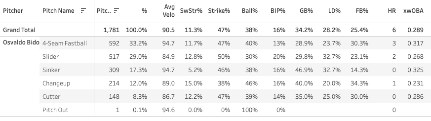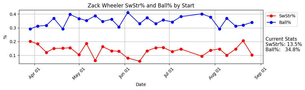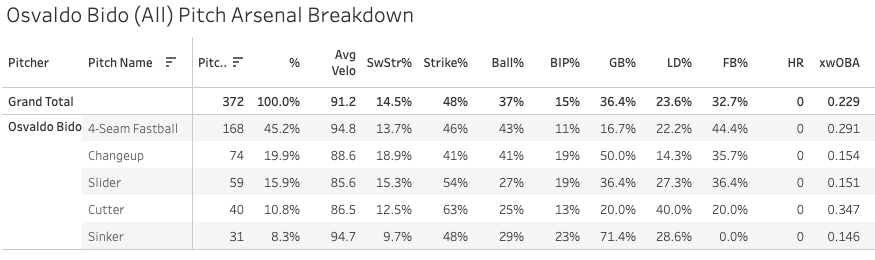 5.1 IP, 6 H, 3 ER, 8 K, 2 BB, 17.6% SwStr%, 36.3% Ball%