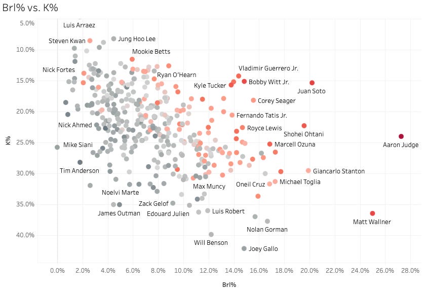 Aaron Judge - 0.556 xwOBA, 30.8% Brl%, 80.6% Contact%, 23.1% Chase%, 16.1% K%