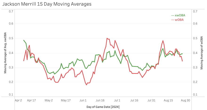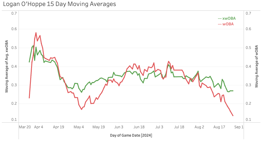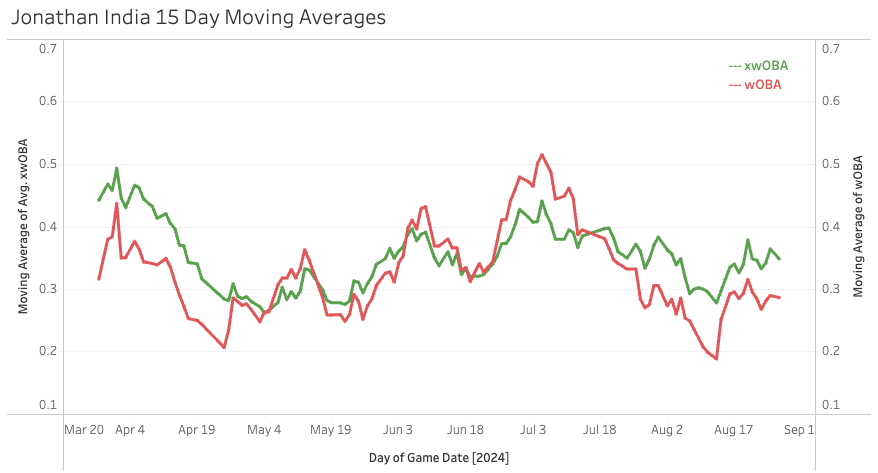 In the first two months, he posted a 7.3% Brl% and a 48% GB%. Since June, those marks are 11.8% and 46%. He’s always hit the ball hard, it was just a matter of getting the ball in the air more - and he’s done that lately.