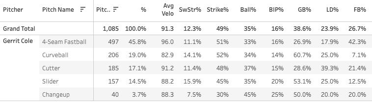 A 12.3% SwStr% over 1,000 pitches from Cole is officially a red flag. This is not the Gerrit Cole we’re used to. The fastball has been good, no doubt, but we are used to Cole having a top-three fastball in the league, and that’s not what we’re seeing now. It seems that all of his pitches have just taken a step back, and that’s resulted in a much less impressive 25.6% K% and 8.1% BB% on the season.