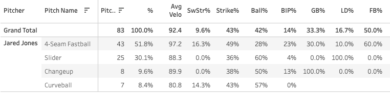 Not a single whiff on the slider and a 60% Ball%. You would have to imagine the feel for the slider comes back next time, at least a little bit, and that could result in a very good start. But we’ll see. We know the kind of upside Jones’ has, so he’s tough to leave on waivers.