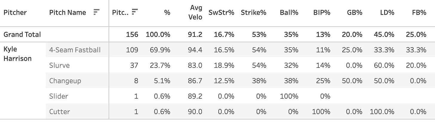 Very high 16.5% SwStr% on his first 109 four-seamers. I doubt that sticks around (although he is left-handed so maybe there’s some of that delivery deception stuff going on), and look - he throws a “slurve” that has gone for a high 18.9% SwStr%. I personally kind of hate how many different variations we have on these breaking balls now, even if it more accurate - it makes stuff a little bit harder to compare. How am I supposed to know what a good SwStr% on a slurve is when almost nobody else throws the pitch. Goofy stuff, but it makes Harrison a really interesting pitcher.
