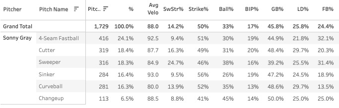 Gray has embraced that his four-seamer isn’t anything special, and has really thrown the kitchen sink at guys. He has five solid pitches, and he’s figured out the right way to use them all together.