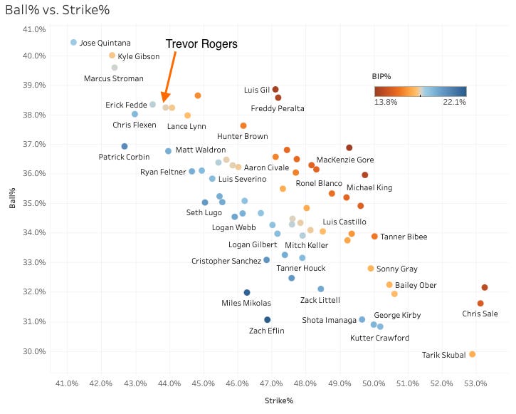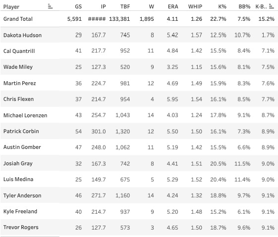 It is hard to stay in a rotation with a single-digit K-BB%. I wouldn’t bet on any of these guys having prominent roles in rotations in a year or two, and the ones that currently have jobs are all on bad teams besides Perez, Lorenzen, and Rogers - and all three of them are only on good teams because they were traded this week. That’s pretty funny, actually, that three guys that were just moved at the deadline show up here.