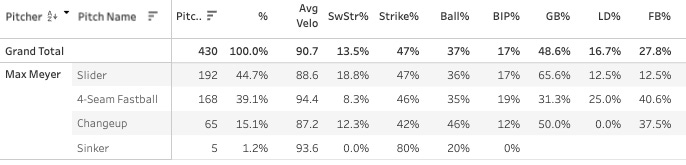 Solid strike throwing yesterday but a bit of bad luck with the hits and runs allowed. That brought his season Strike% to 47% (league average) and the SwStr% to a strong 13.5% mark.