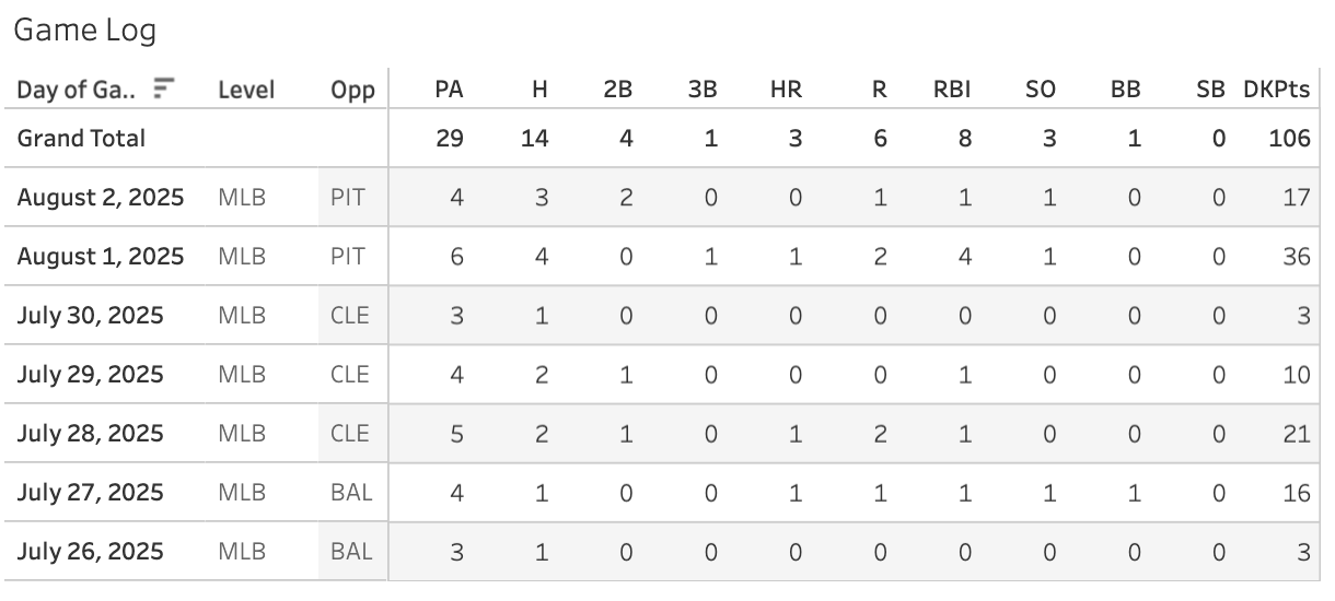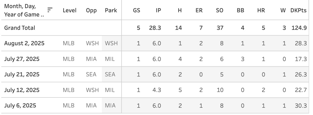 Man that’s a soft, soft schedule. But five strikeouts and no more than than 2 ER in any start. The walks have shown up in these last two and he’s given up five homers, so it’s not a perfect resume, but he’s doing a ton better than I ever expected.