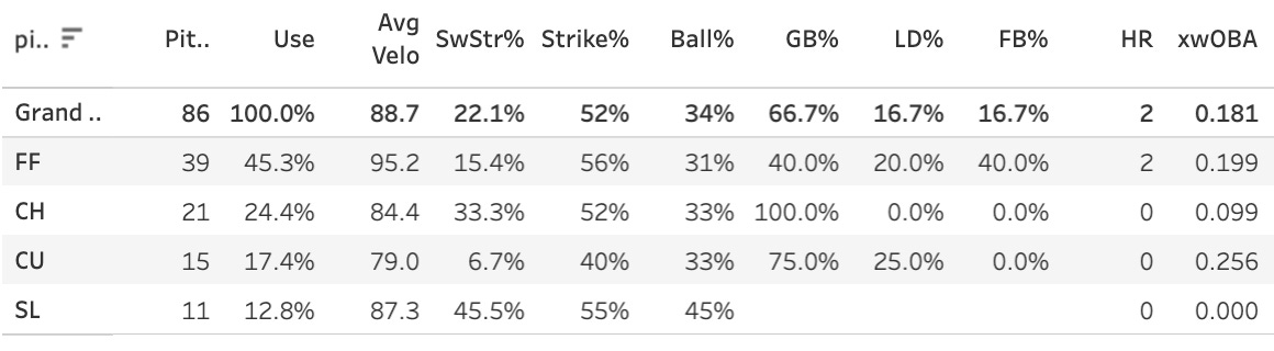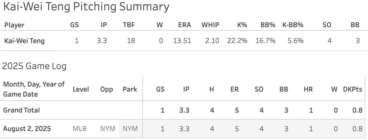 Kai-Wei Teng (SF): 3.33IP, 4H, 5ER, 4SO, 3BB
