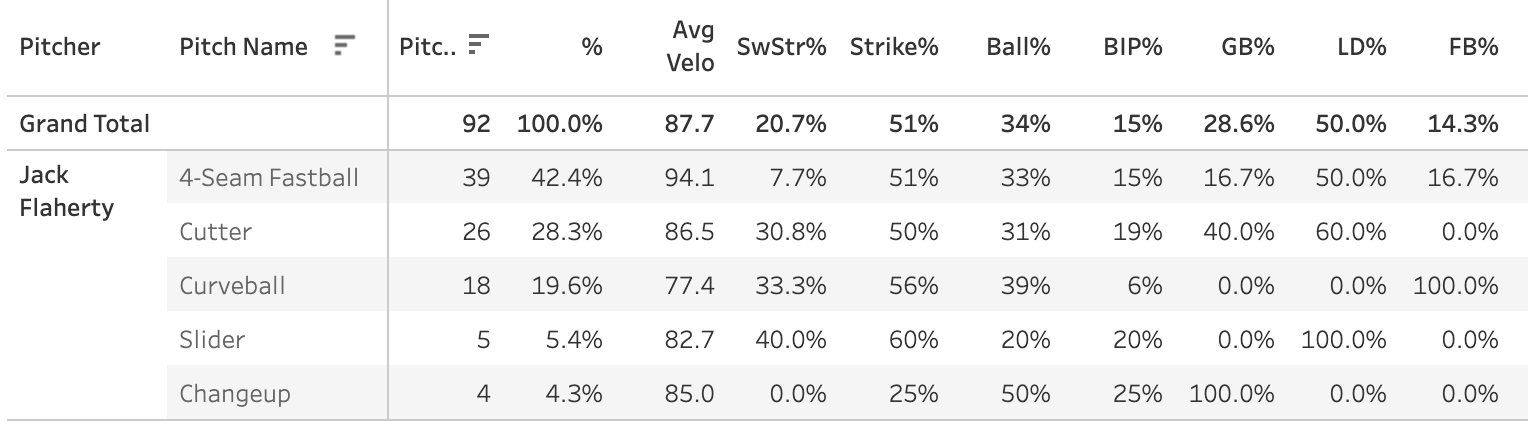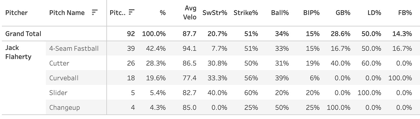 Jack Flaherty's FC velo (26 pitches) DOWN -2.2mph to 86.5
